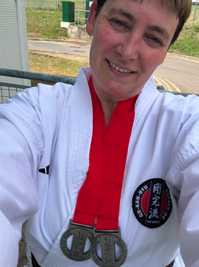 With the support of my peers, I worked hard and progressed through the early grade levels and am now a Brown Belt! I never imagined I’d have the self-confidence to face sparring/kumite and potentially get hit again (although I do still struggle with this at times but I’m getting there). I have competed in tournaments and won a Gold medal in kumite which is something I am proud to have achieved after overcoming my fears.