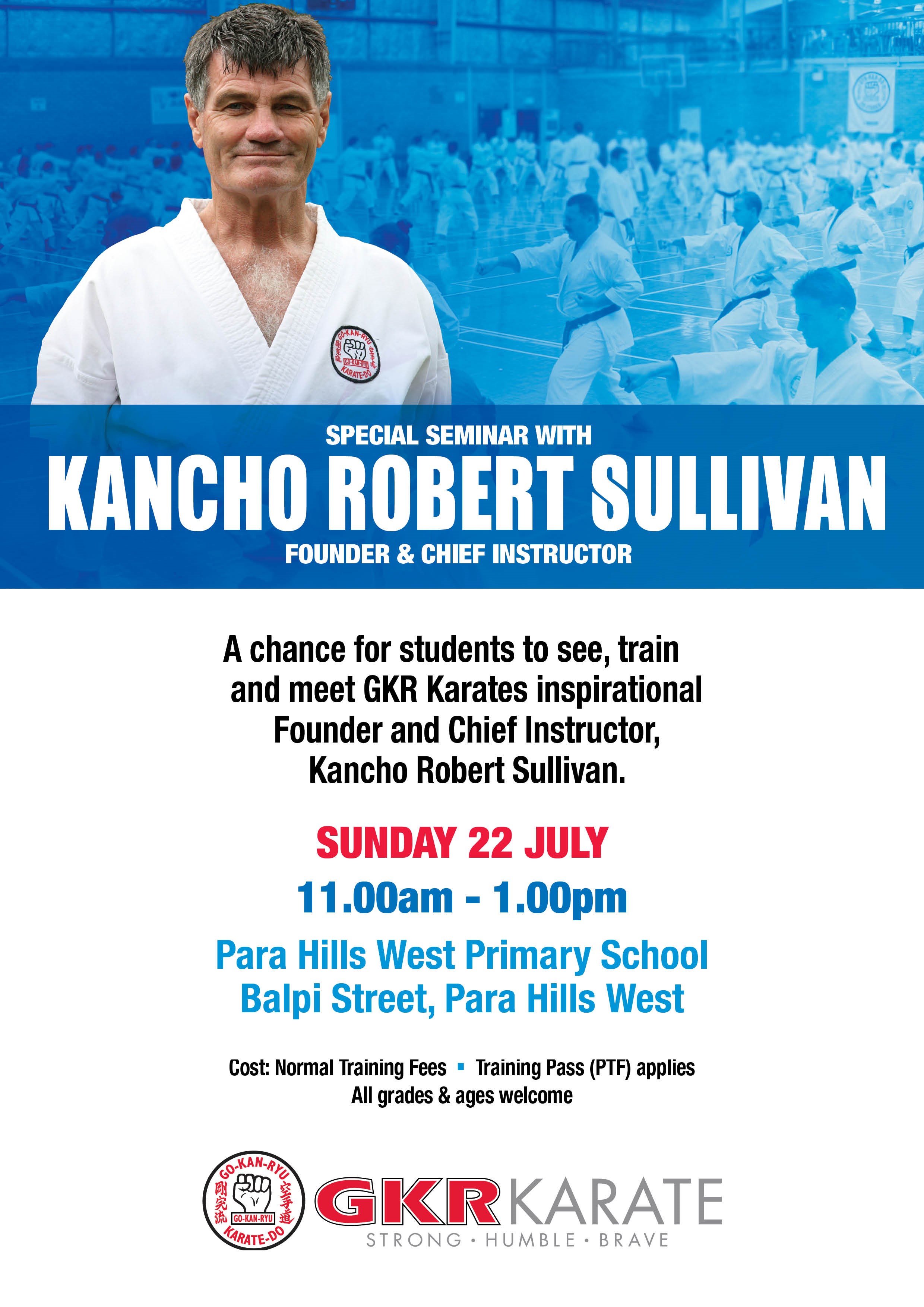 On Sunday the 22nd of July, GKR Karate’s Founder and Chief Instructor, Kancho Robert Sullivan will be conducting a special seminar at the Para Hills West Primary School.
